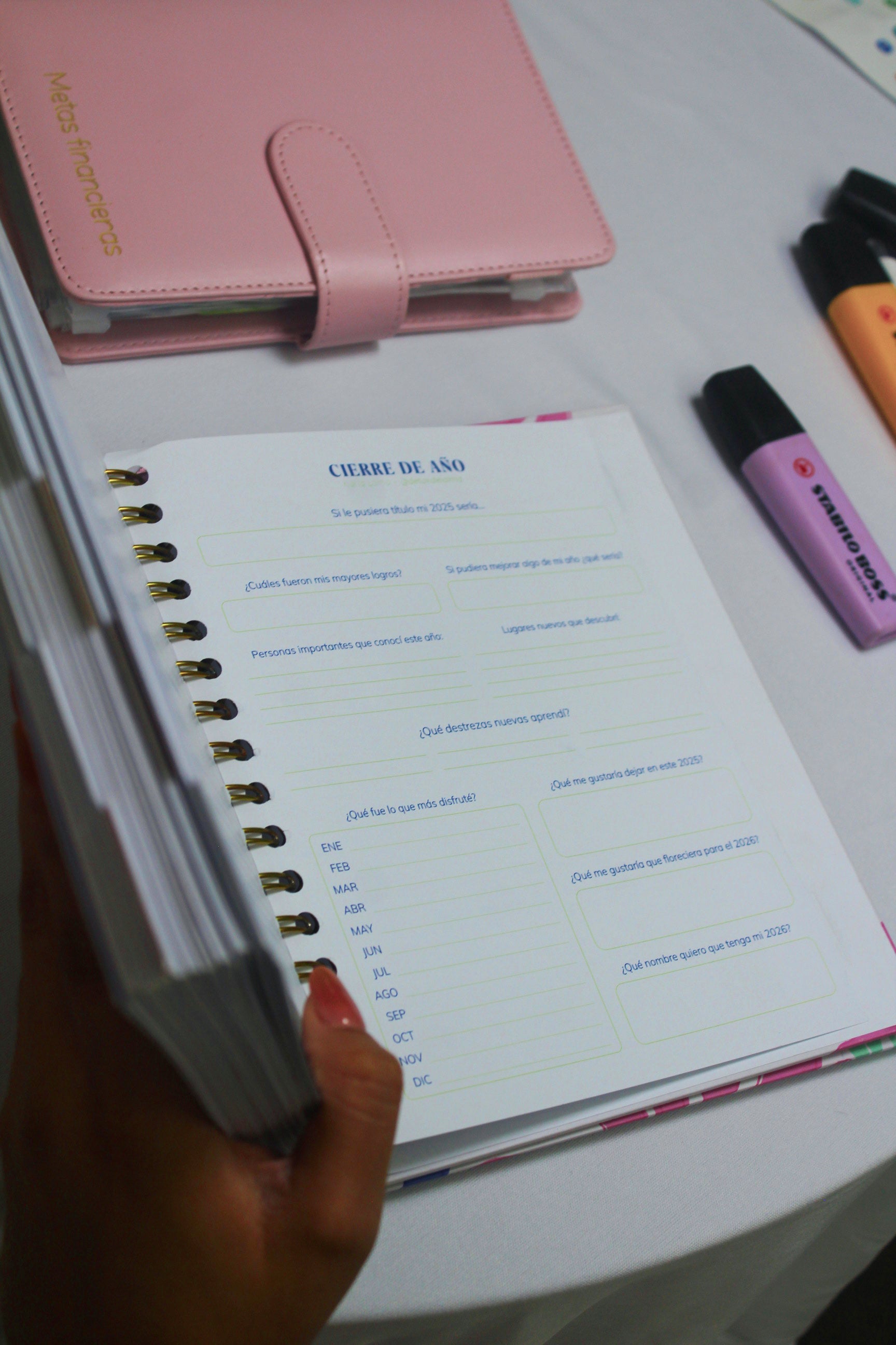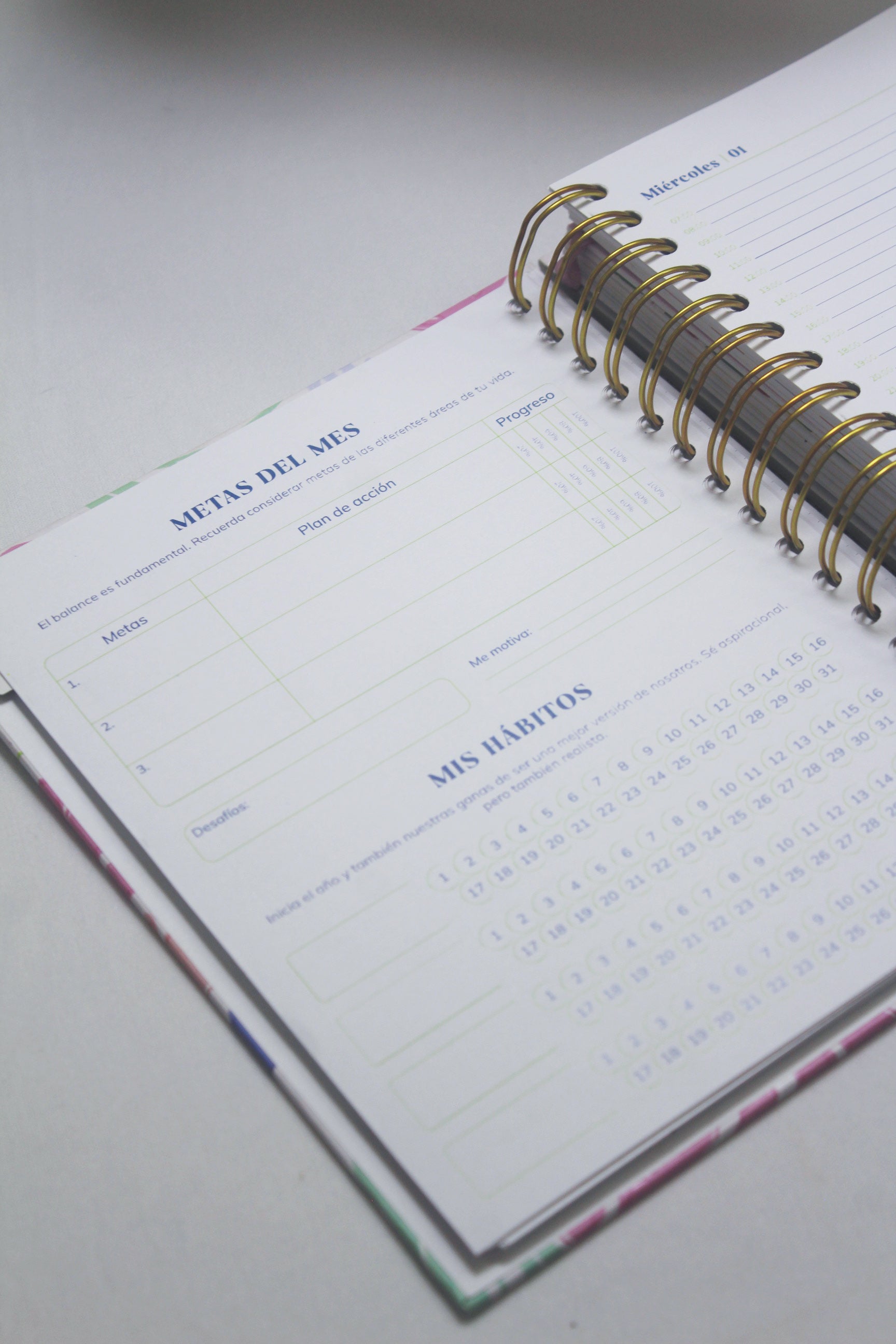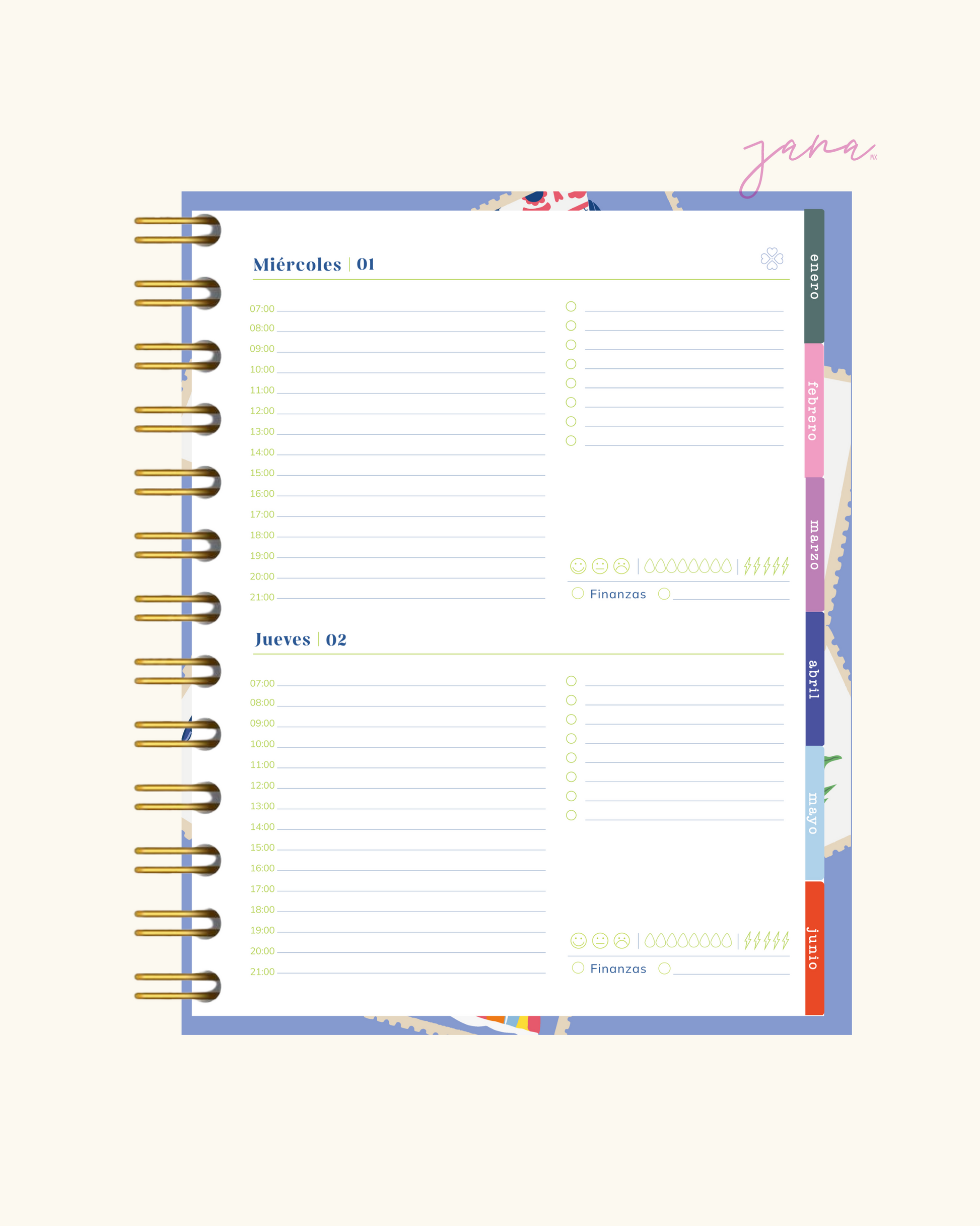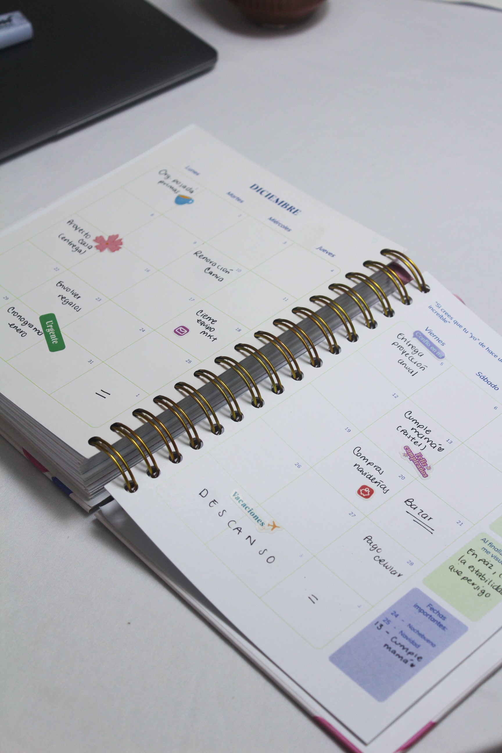 - Espacio diario (2 días por página / fines de semana: 3 días por página) para citas, pendientes y monitoreo de hábitos.