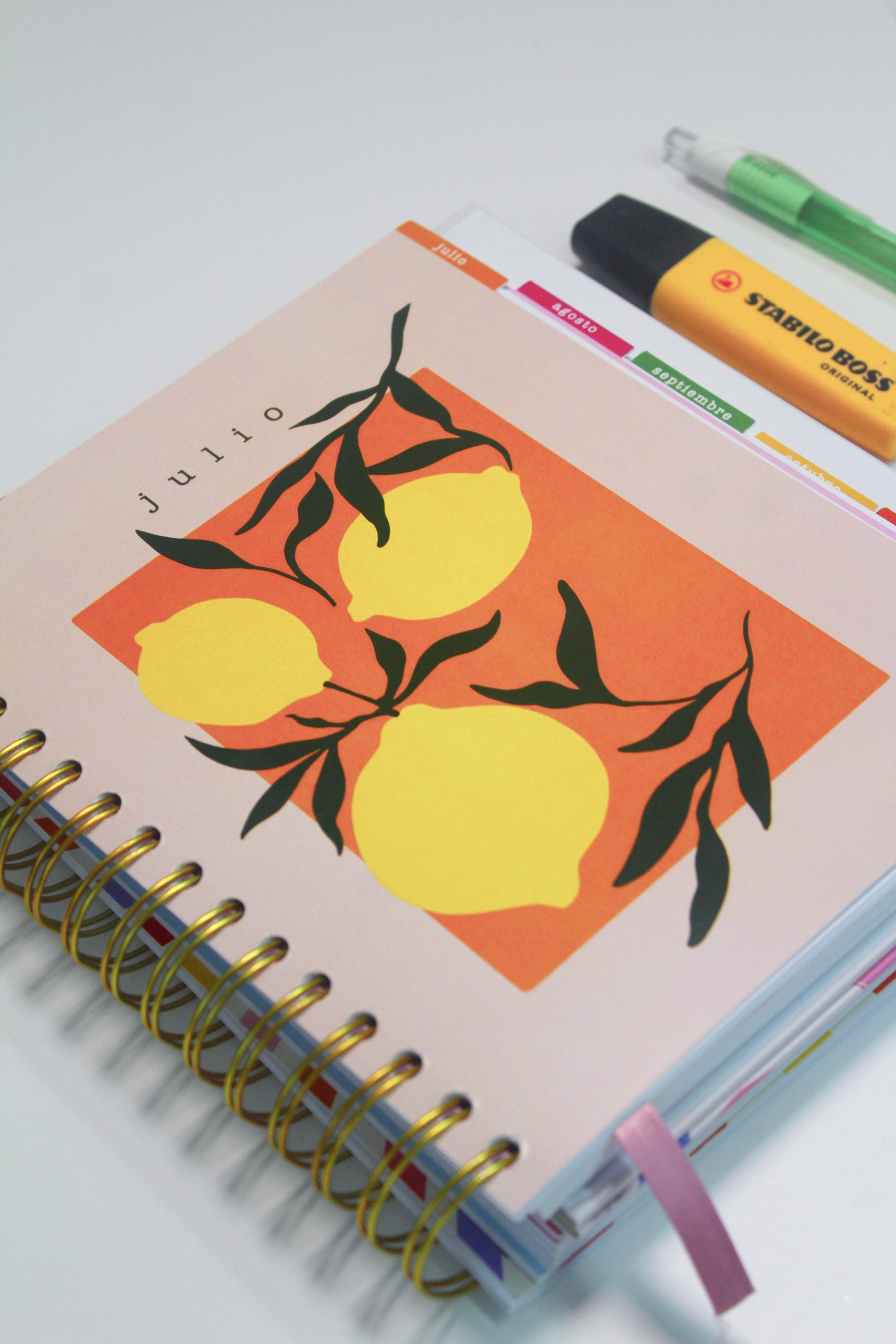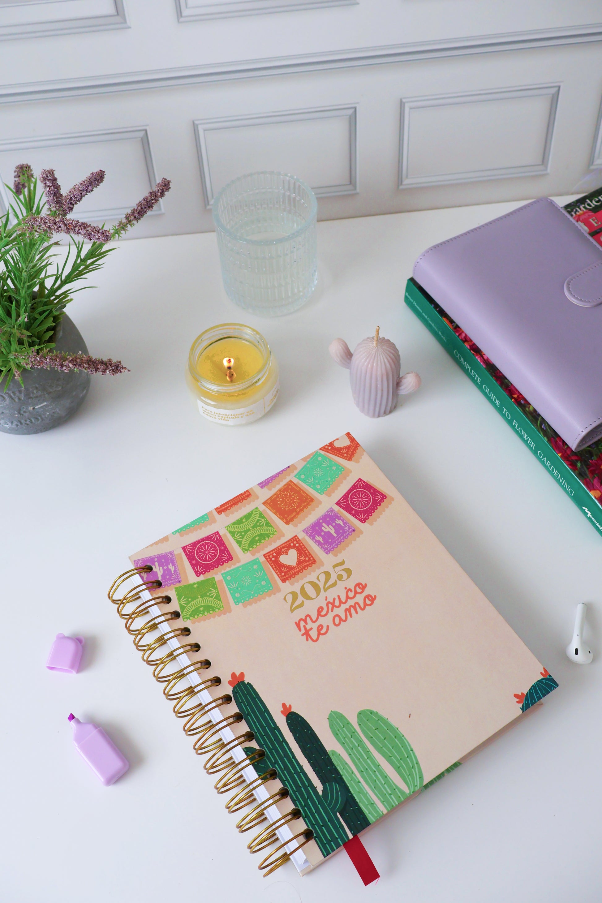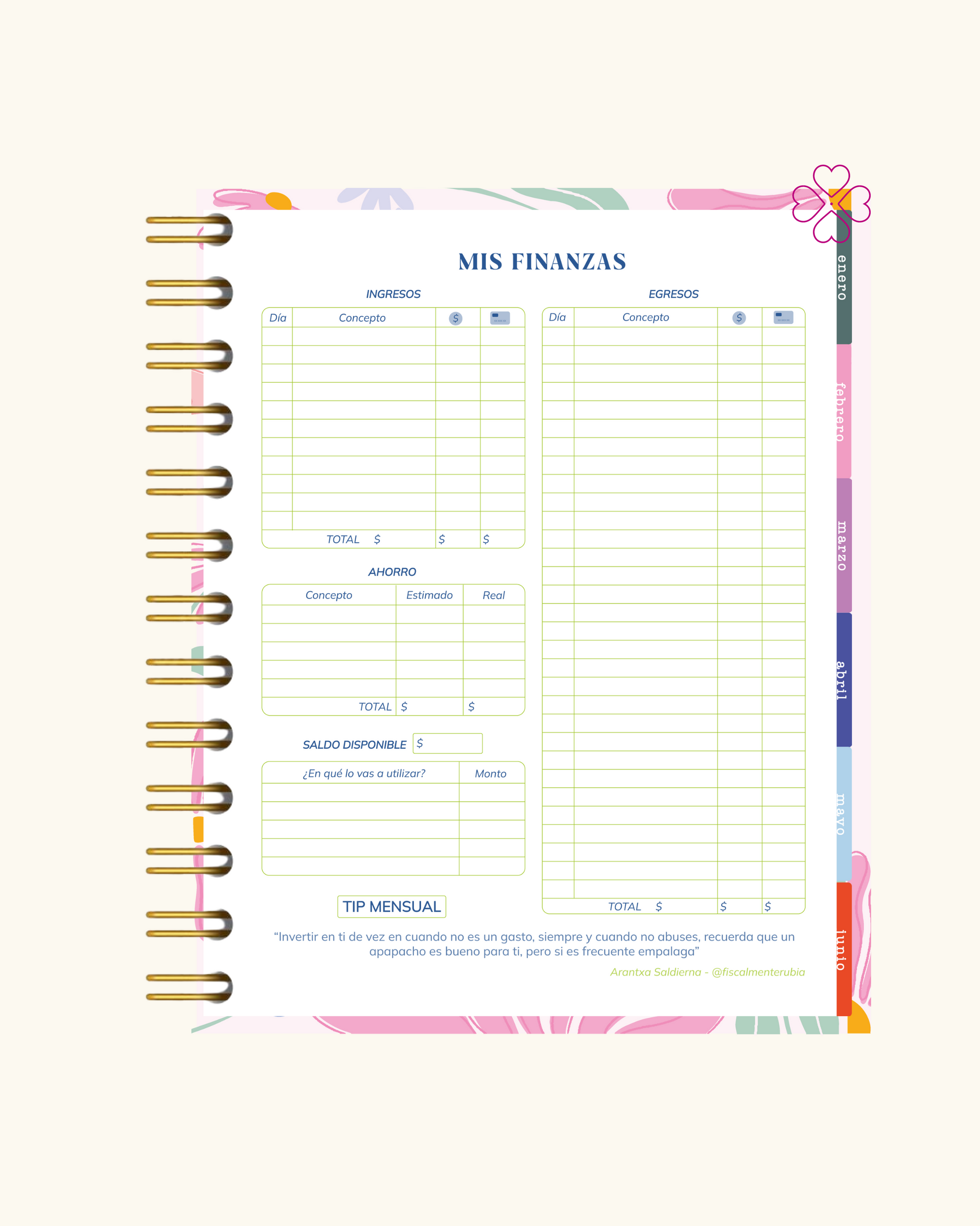 - Espacio diario (2 días por página / fines de semana: 3 días por página) para citas, pendientes y monitoreo de hábitos.