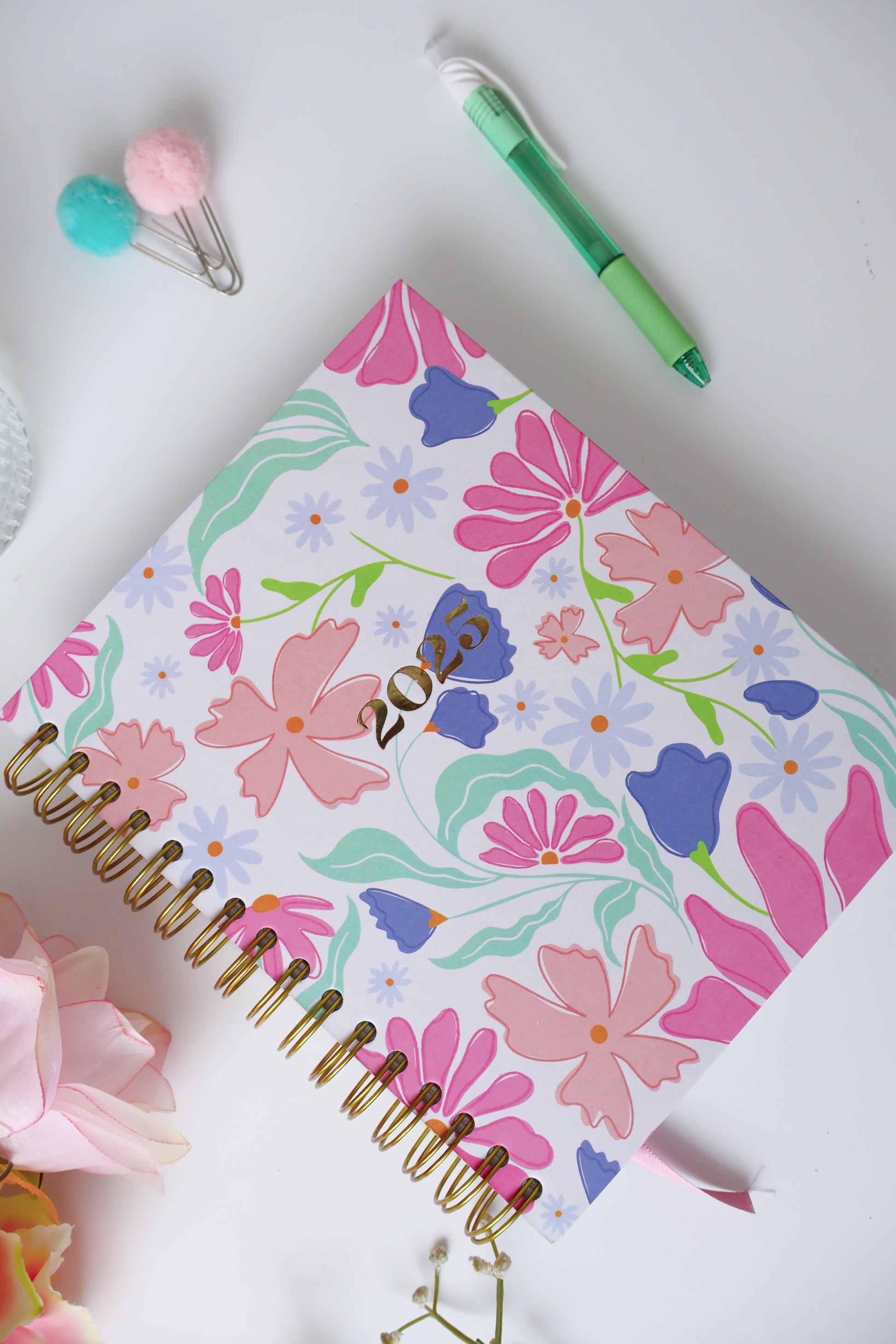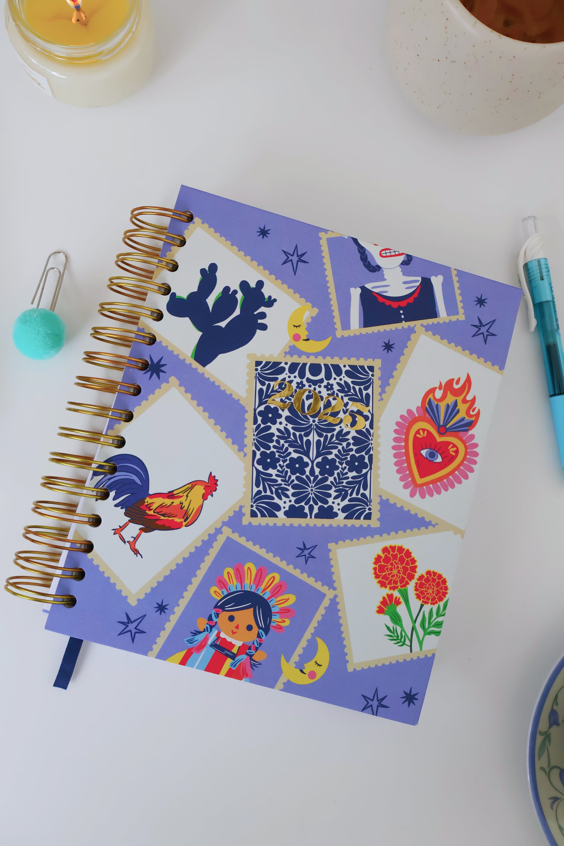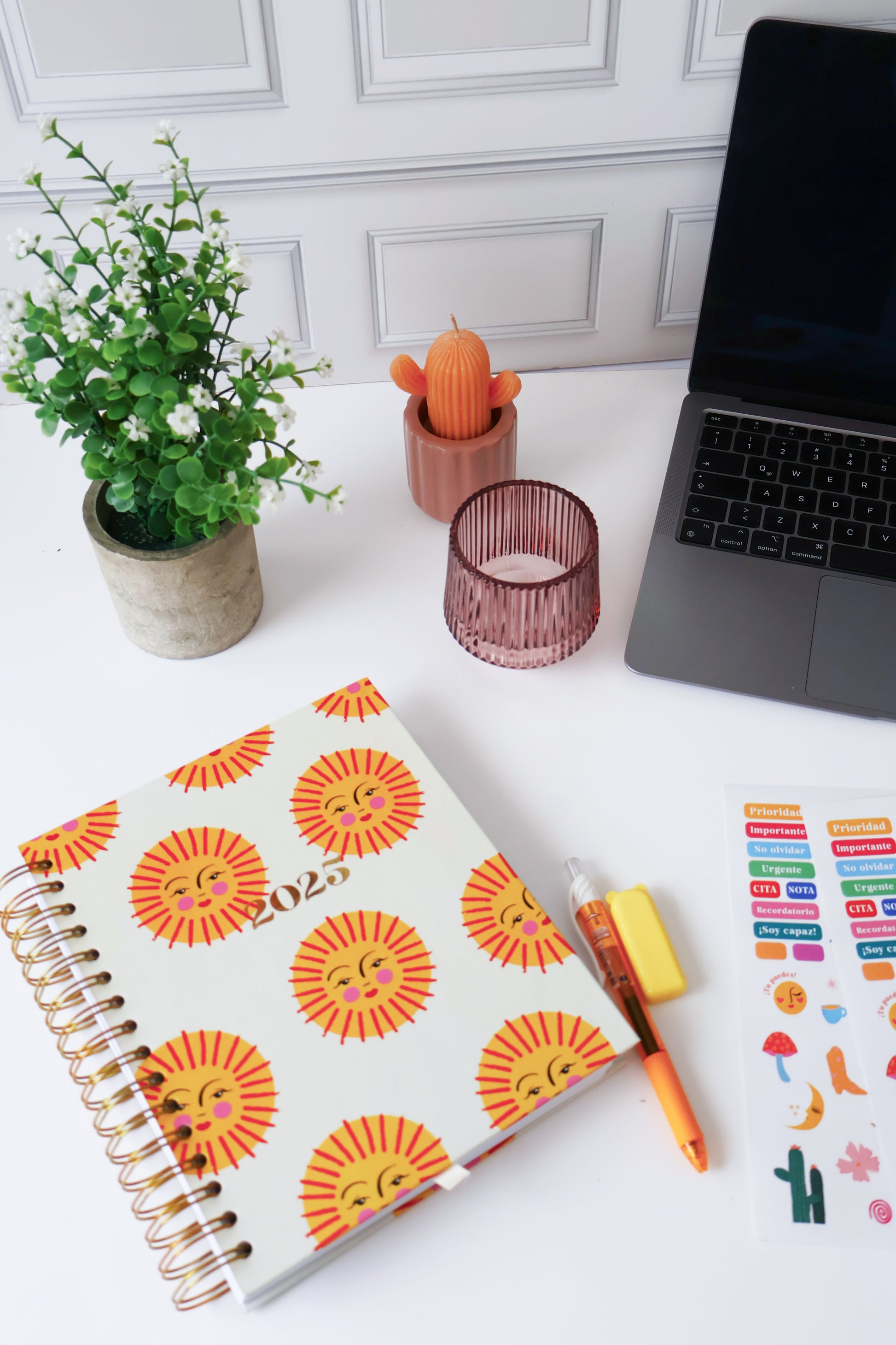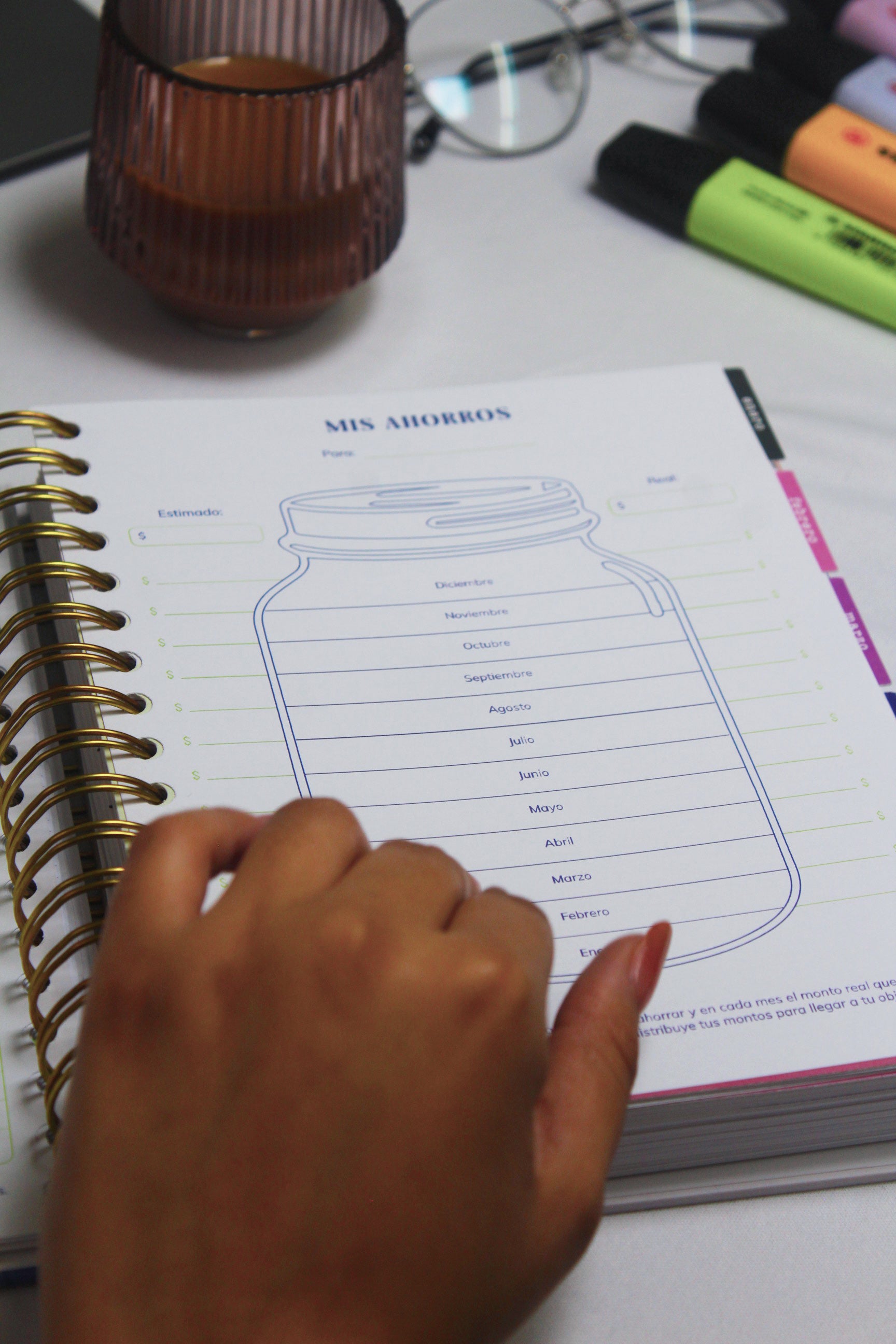 - Espacio diario (2 días por página / fines de semana: 3 días por página) para citas, pendientes y monitoreo de hábitos.
